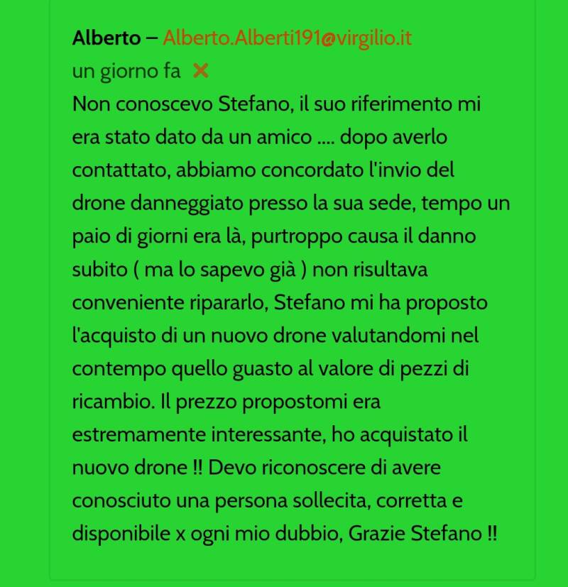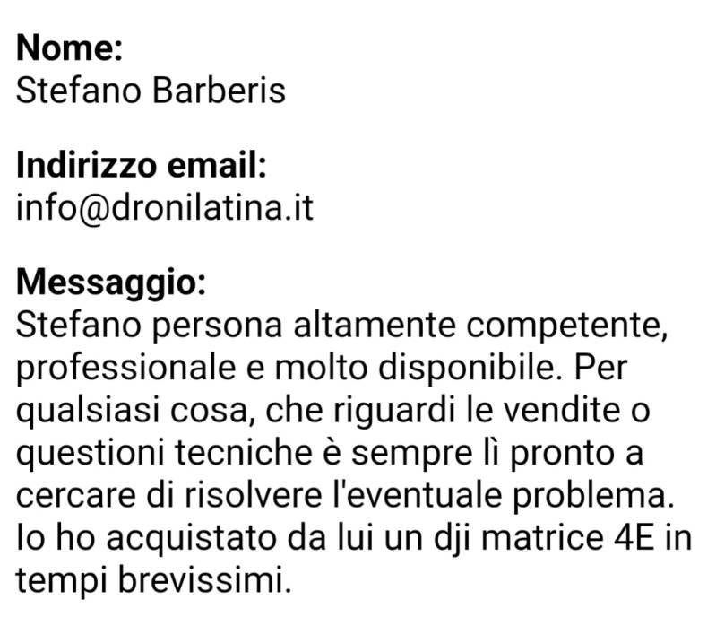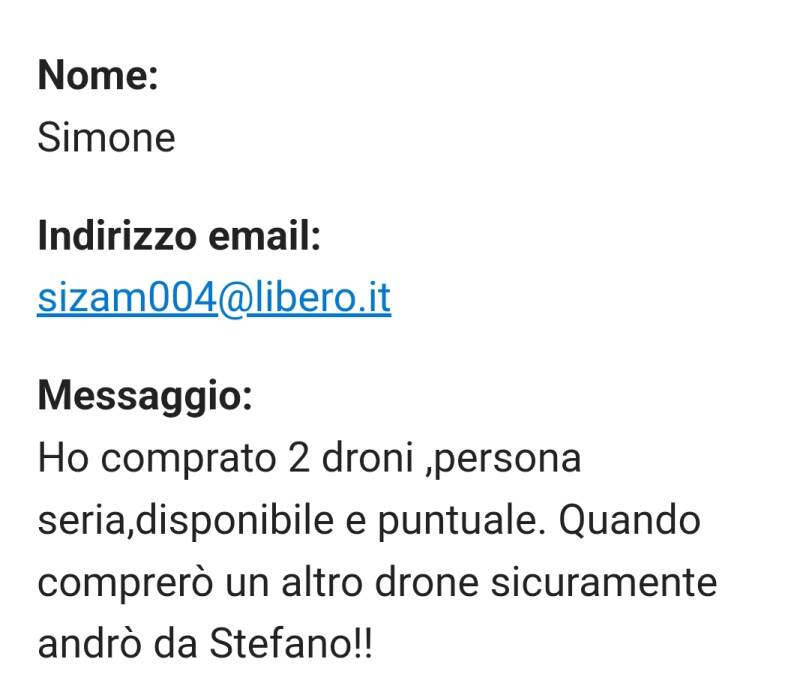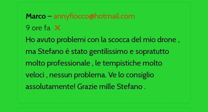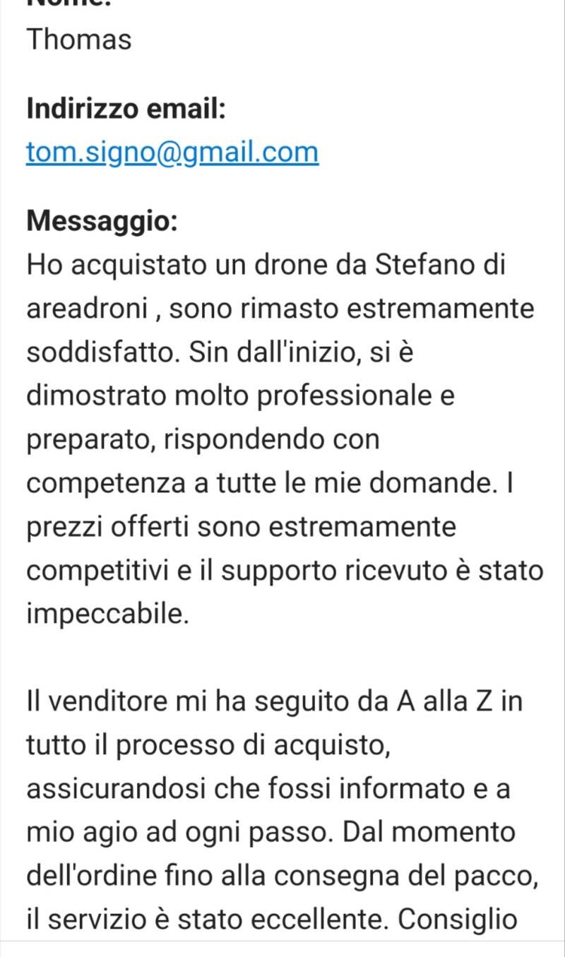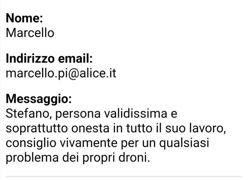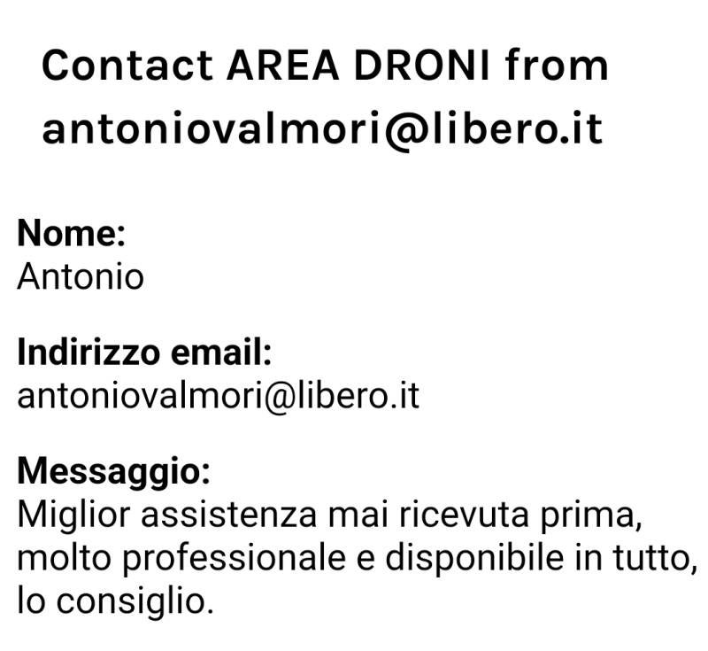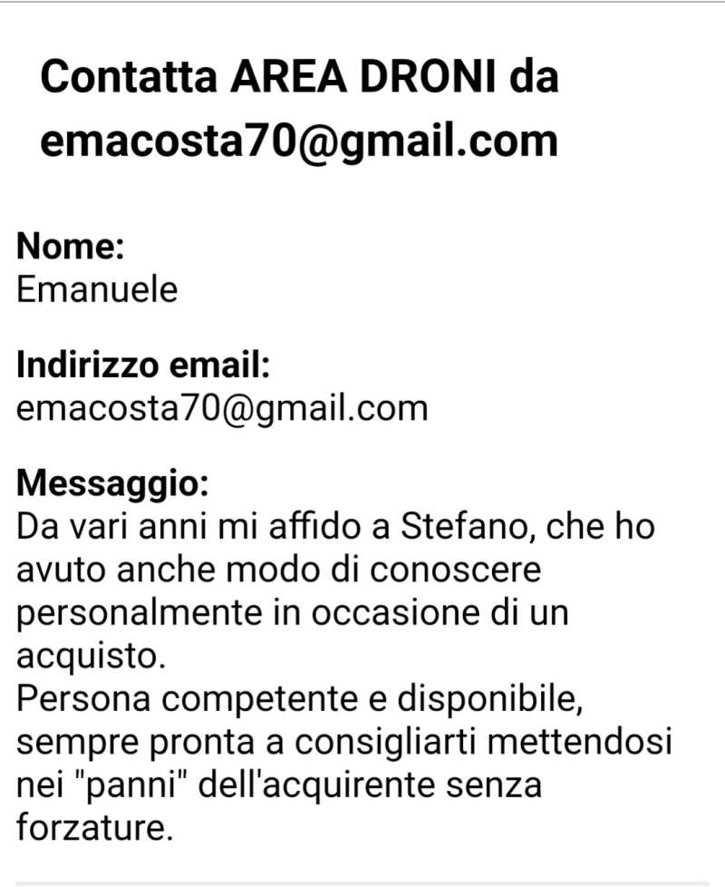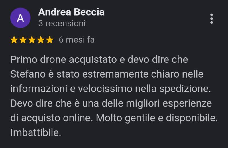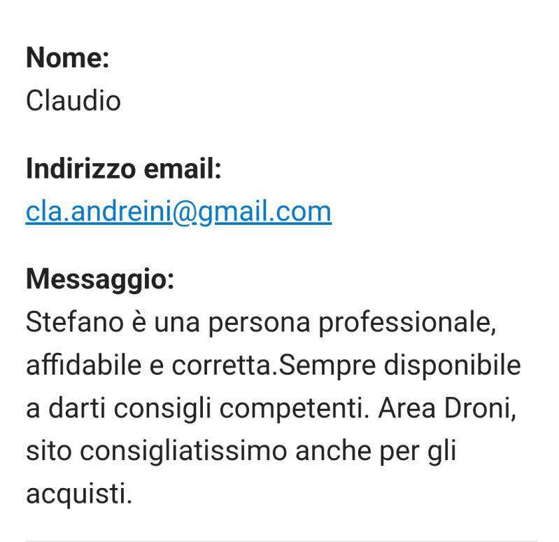 Apprezzo molto la sua professionalità e la trasparenza con cui gestisce ogni fase del servizio. Consiglio vivamente Stefano e areadroni.com a chiunque abbia bisogno di assistenza o riparazioni per il proprio drone: affidabilità e attenzione al cliente sono davvero al top