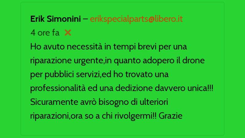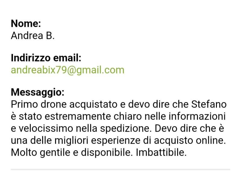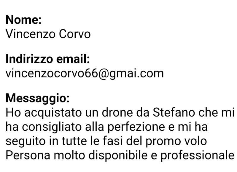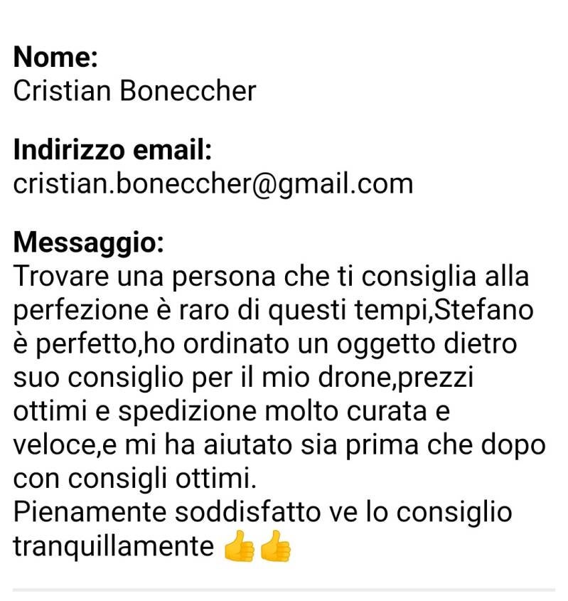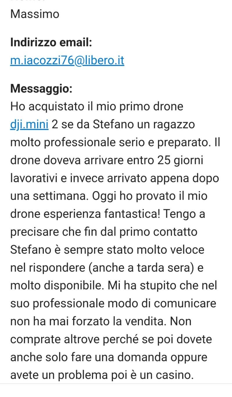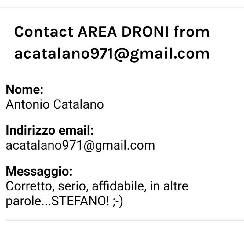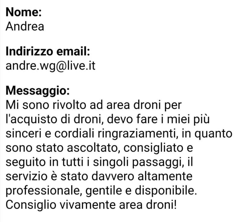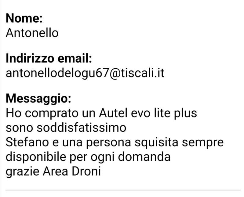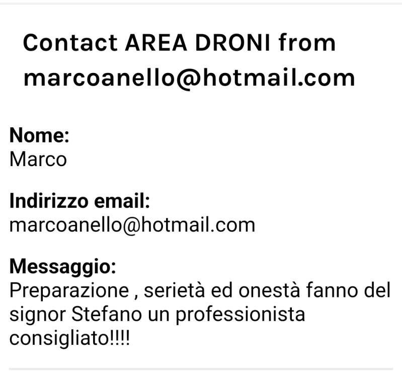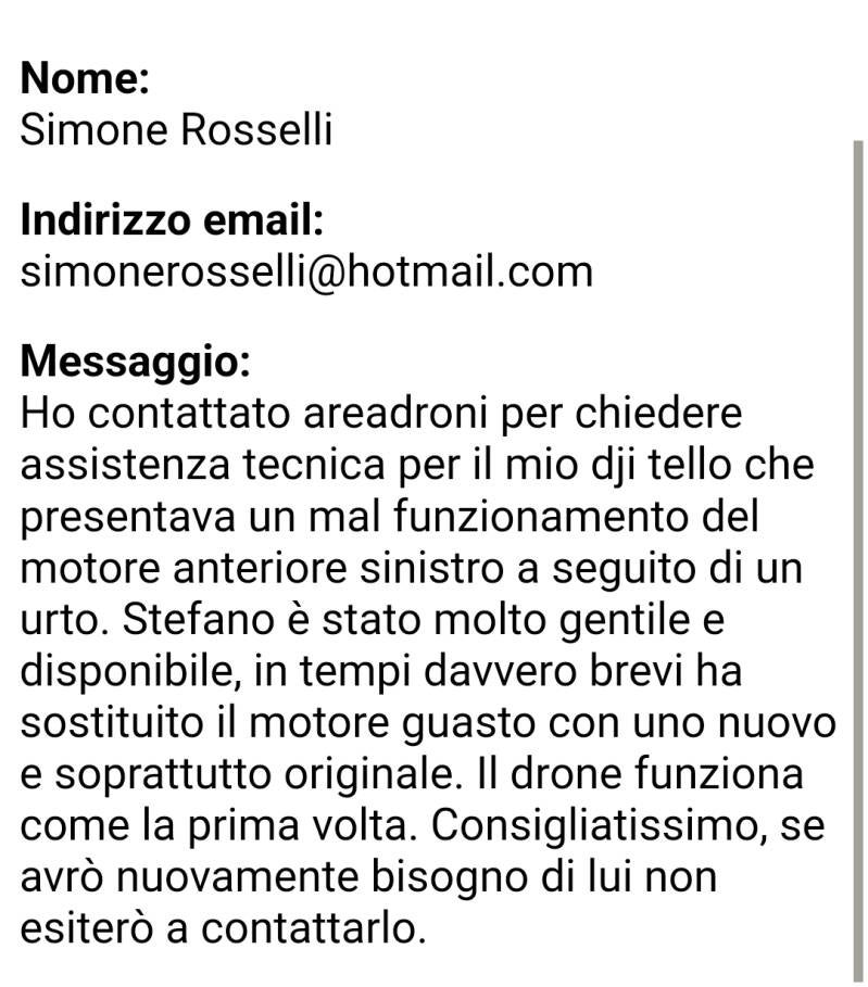 Apprezzo molto la sua professionalità e la trasparenza con cui gestisce ogni fase del servizio. Consiglio vivamente Stefano e areadroni.com a chiunque abbia bisogno di assistenza o riparazioni per il proprio drone: affidabilità e attenzione al cliente sono davvero al top
