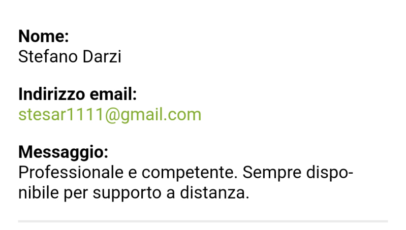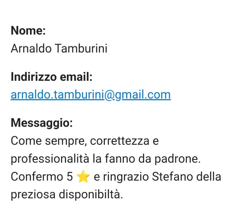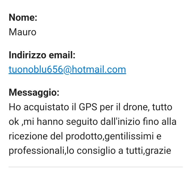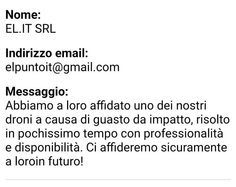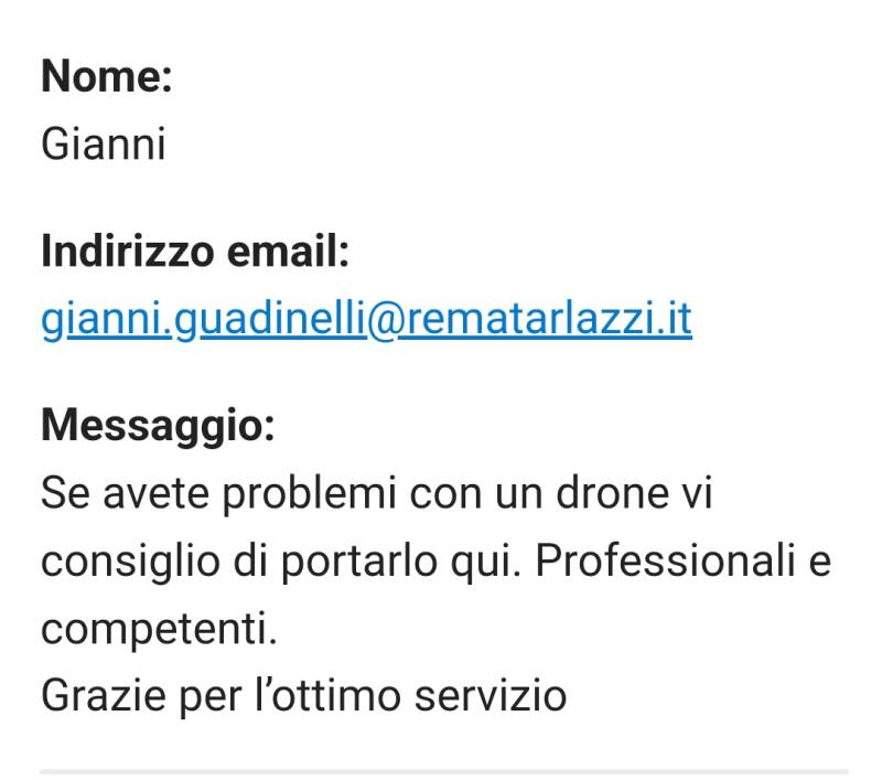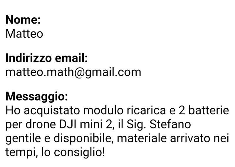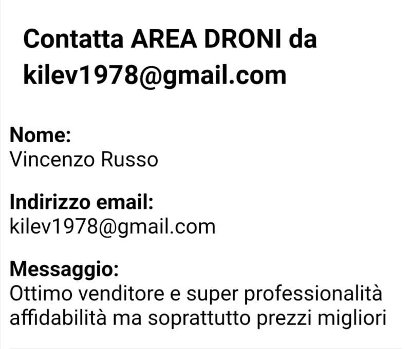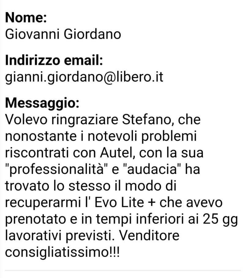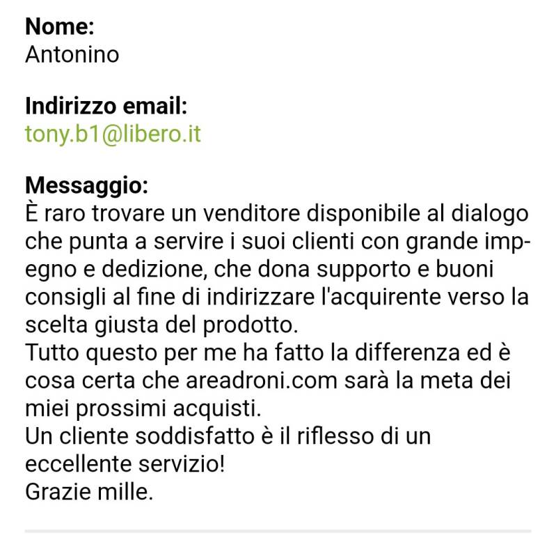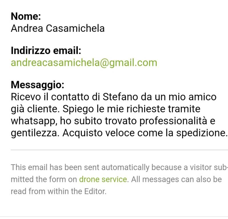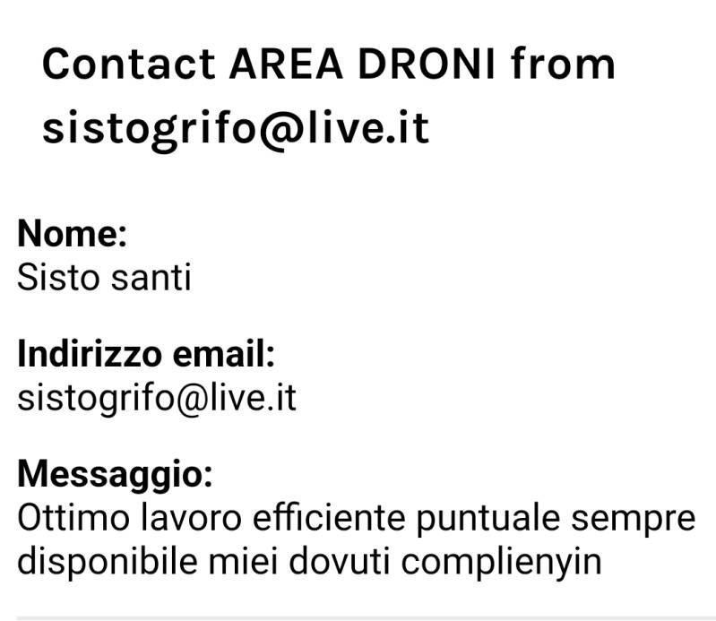 Apprezzo molto la sua professionalità e la trasparenza con cui gestisce ogni fase del servizio. Consiglio vivamente Stefano e areadroni.com a chiunque abbia bisogno di assistenza o riparazioni per il proprio drone: affidabilità e attenzione al cliente sono davvero al top