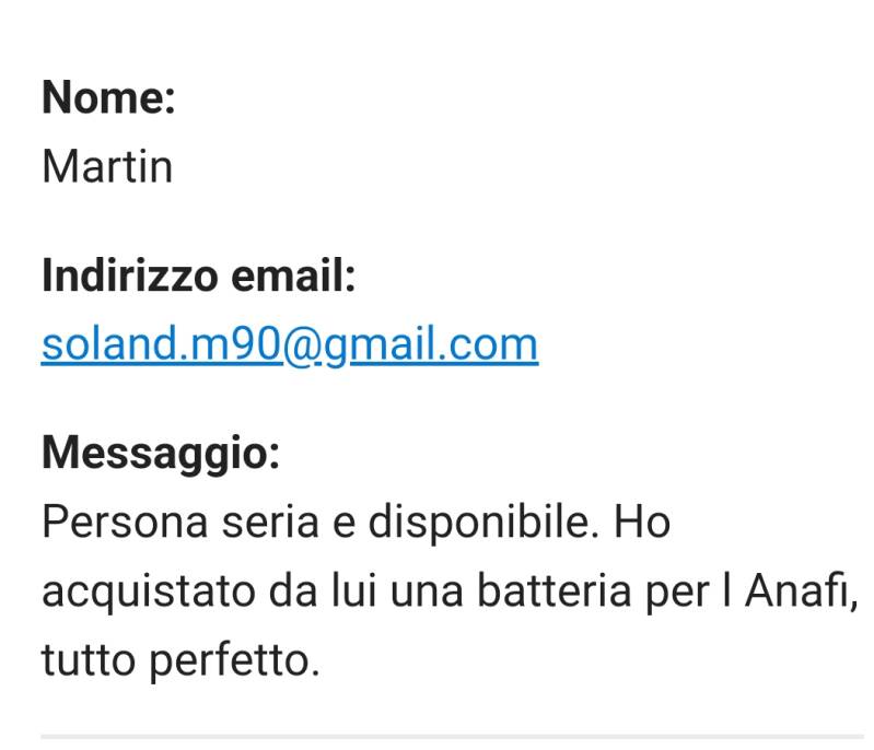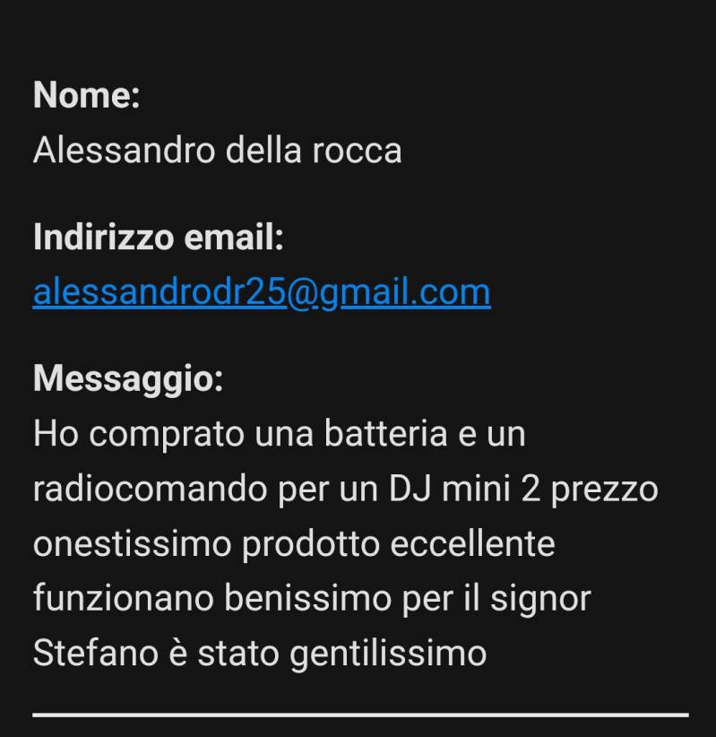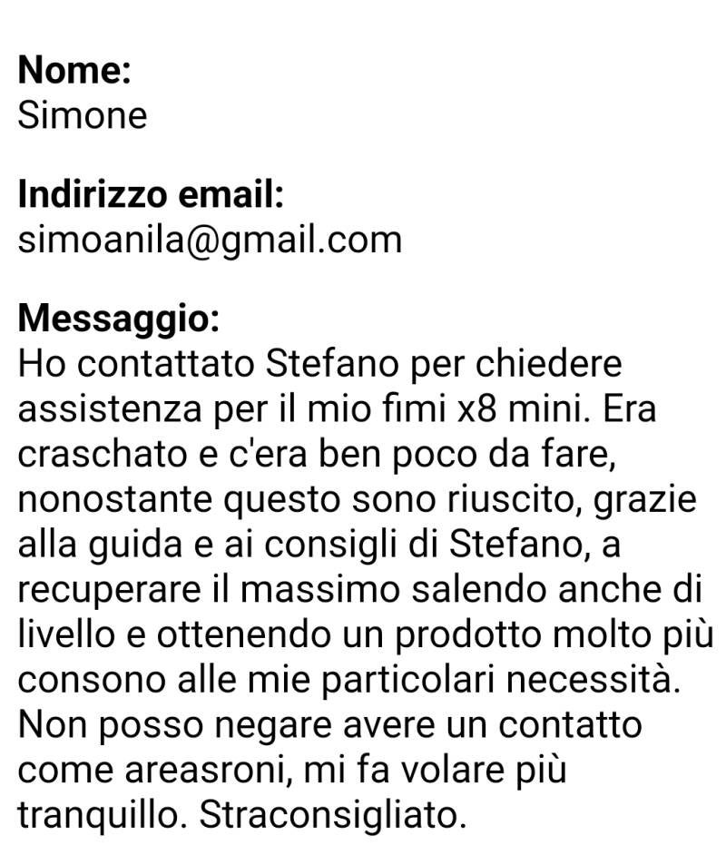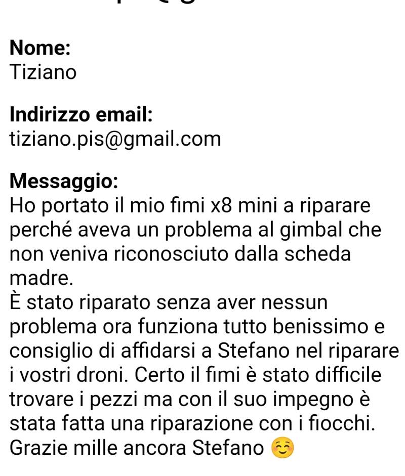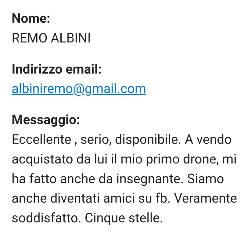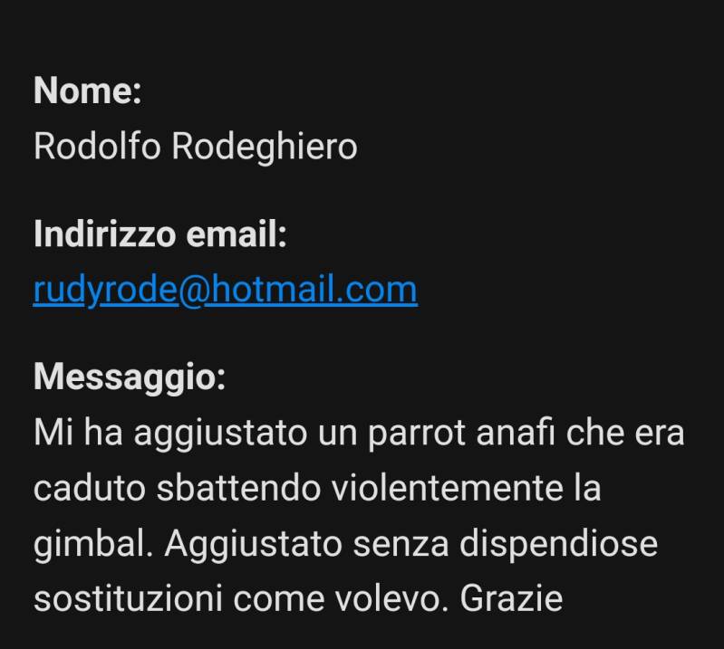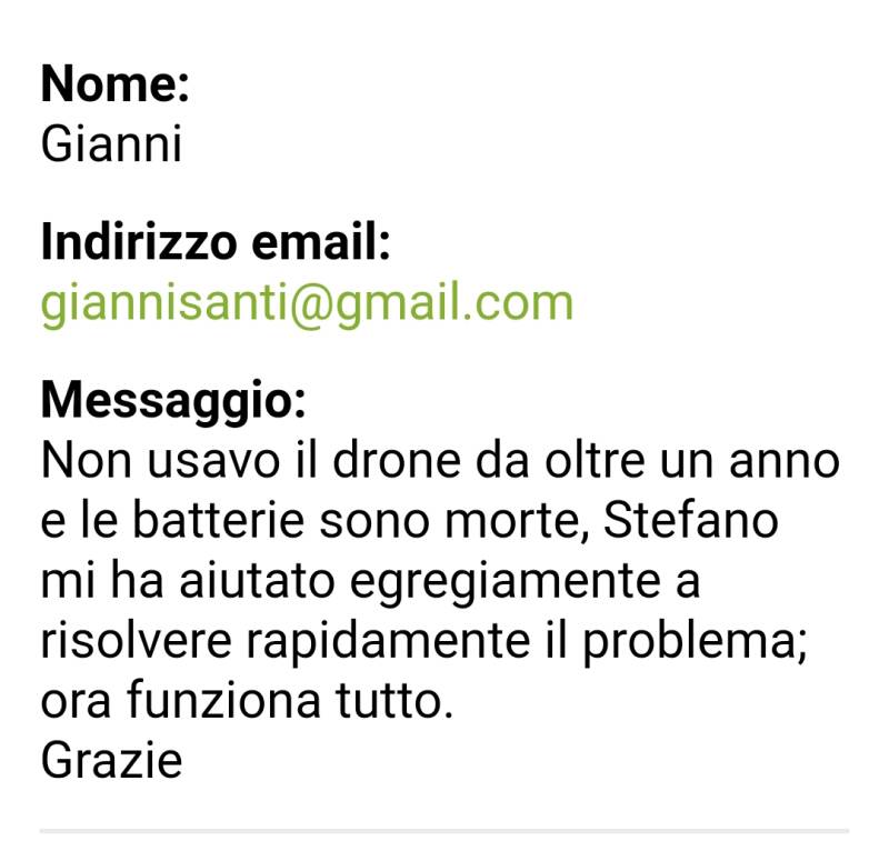 Ho recentemente fatto riparare il mio DJI Mini 3 Pro da Stefano di areadroni.com e sono rimasto estremamente soddisfatto del servizio. Stefano si è dimostrato veloce, gentile e onesto: prima di procedere con la riparazione mi ha fornito un preventivo chiaro e dettagliato, permettendomi di valutare serenamente il lavoro da svolgere. Una volta ricevuto il drone sistemato, mi ha anche dato numerosi consigli utili su come mantenerlo efficiente nel tempo, dimostrando grande competenza e disponibilità.