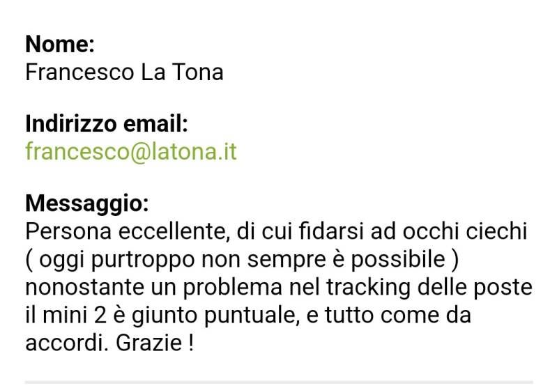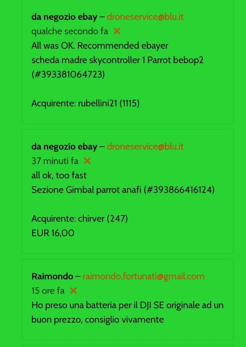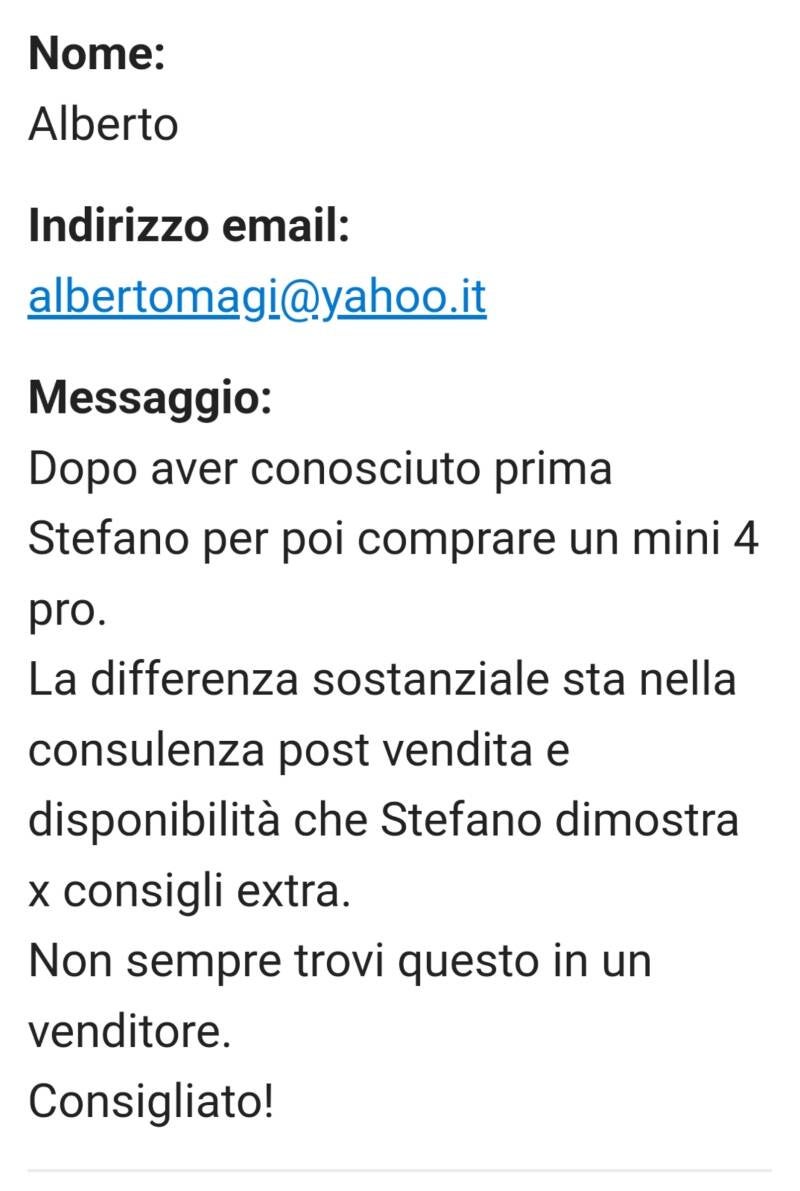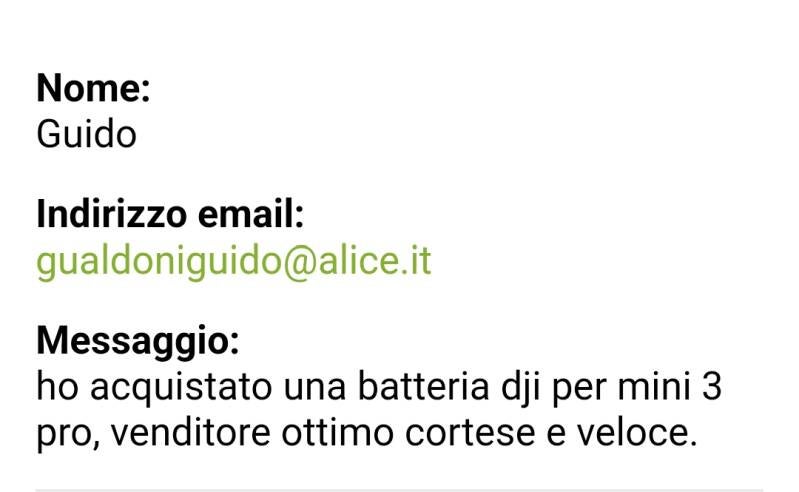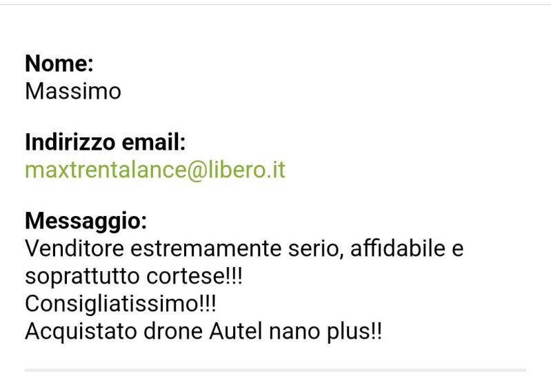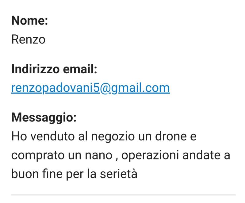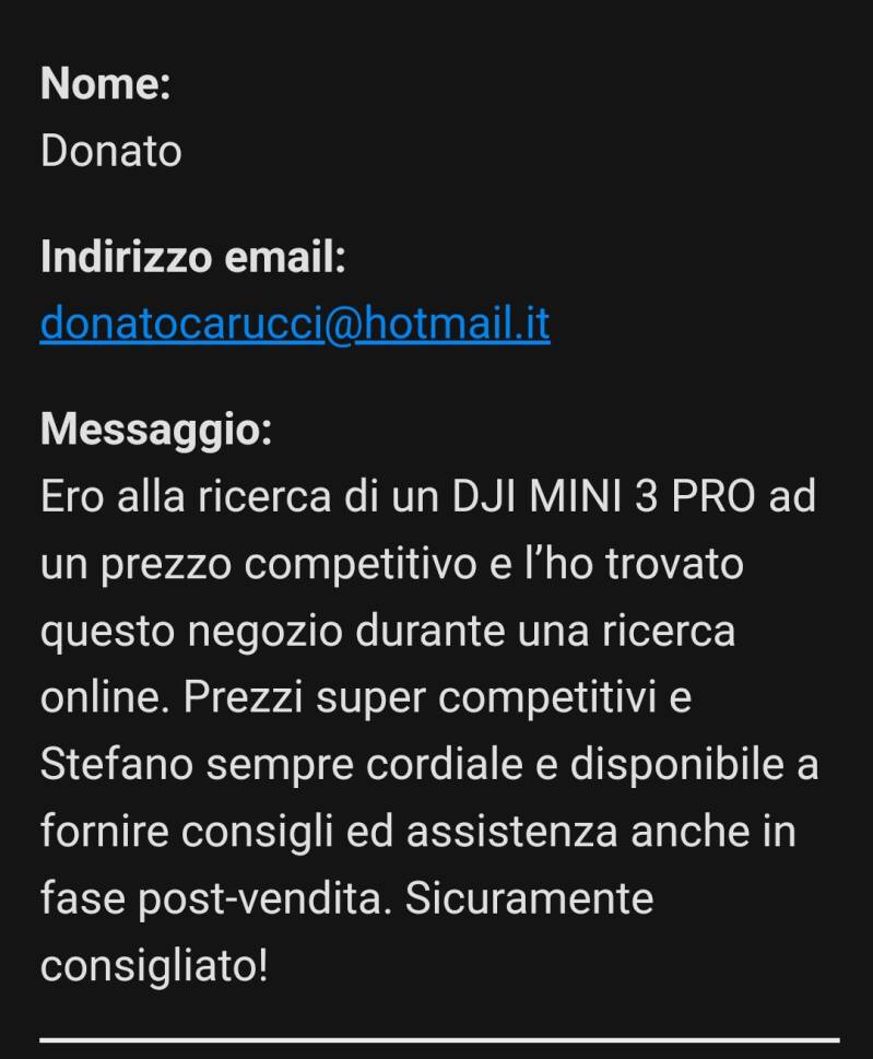 Ho recentemente fatto riparare il mio DJI Mini 3 Pro da Stefano di areadroni.com e sono rimasto estremamente soddisfatto del servizio. Stefano si è dimostrato veloce, gentile e onesto: prima di procedere con la riparazione mi ha fornito un preventivo chiaro e dettagliato, permettendomi di valutare serenamente il lavoro da svolgere. Una volta ricevuto il drone sistemato, mi ha anche dato numerosi consigli utili su come mantenerlo efficiente nel tempo, dimostrando grande competenza e disponibilità.
